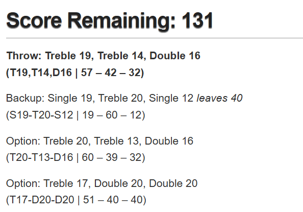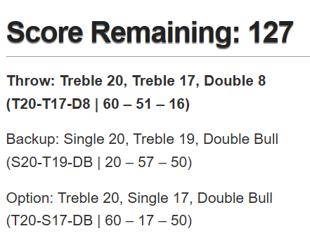Es gibt aber Wege, die sich etabliert haben und empfohlen werden. Wenn du z. B. 127 Checkout Weg googlest, findest du sofort den Weg, der sich etabliert hat. Bei der 127 aus dem einfachen Grund, dass es nur einen Weg gibt, der dir als Spieler bei nur einem Triple ein Finish lässt, ganz gleich, ob es der erste Dart oder der zweite Dart ist.