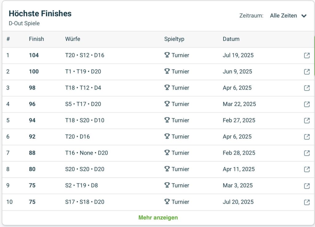 Wenn du lokal Turniere spielst, die über die 2K Software durchgeführt werden, siehst du neben Spielen mit einem Fähnchen, dass es dort entweder ein Highfinish, einen Highscore oder ein Shortleg gab. So kannst du nachsehen, ob du selbst schon ein Highfinish lokal gespielt oder eines kassiert hast.