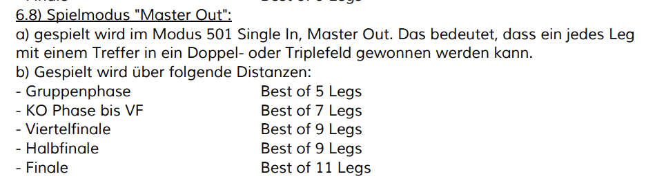 Der Master-Out Modus ist im E-Dart deutlich mehr verbreitet als im Steeldart. Du findest nur wenig Turniere auf lokaler Ebene, die im Master-Out Modus stattfinden. Aber es gibt sie. Schaue gerne auf etwa 2K Darts Software nach. Du musst gegebenenfalls etwas suchen, da es leider keinen Filter gibt für den Modus, in dem das Turnier stattfindet.