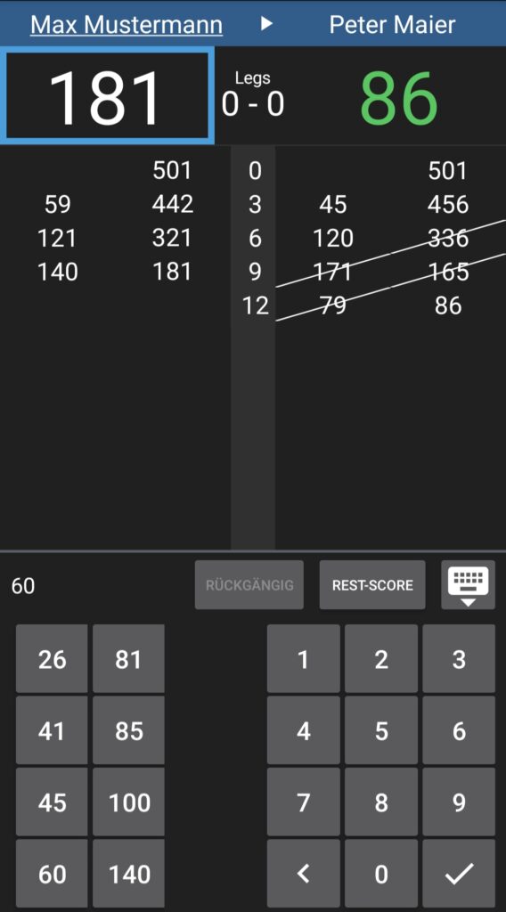 Wenn du dich vertippt oder verrechnet hast, kannst du es über “Rückgängig” ganz einfach korrigieren. Du solltest dabei nur dran denken, dass du nicht den Wurf des nachfolgenden Werfers unterbrichst. Warte daher am besten, bis er die 3 Darts geworfen hat, und sag ihm ggf. dass er kurz mit dem Rausnehmen der Darts warten soll, weil du noch etwas korrigieren musst.