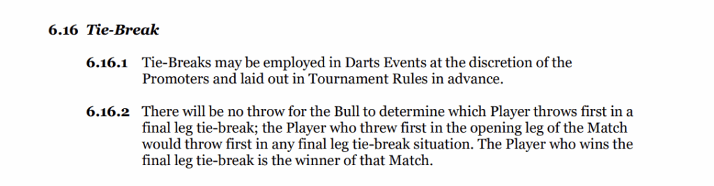 Sind wir dagegen beim World Matchplay oder der Weltmeisterschaft, so muss dort das Spiel am Ende mit zwei Legs Vorsprung gewonnen werden. Damit es nicht ewig geht, gibt es ein Limit, bei dem dann ein Sudden Death Leg entscheidet. Bei der WM ist es z. B. das 5-5 in Legs im letzten Satz.