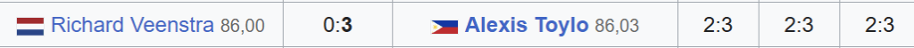 Im Satzmodus kann ein 3-0 auch ein enges Spiel bedeuten, bei dem jeder Satz in 3-2 Legs beendet wurde.